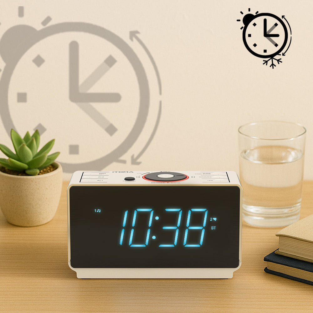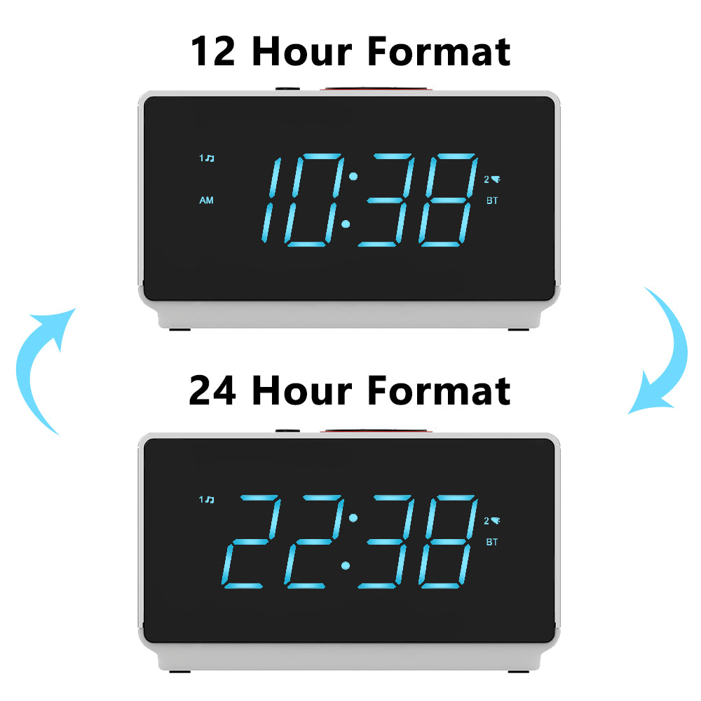 The alarm clock's 1.4-inch Ice Blue LED display screen shows the time in large and clear numbers, makes it easy to read from across the room at any angle.