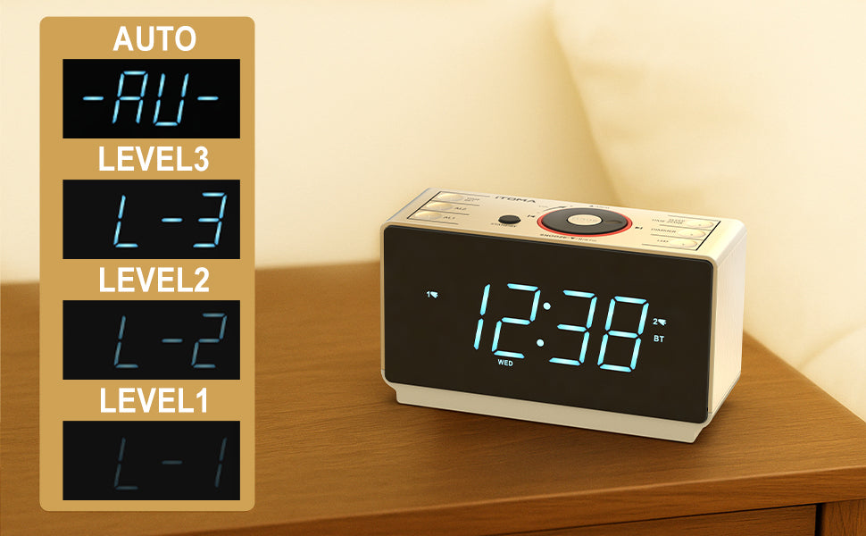 - ULTRA CLEAR DISPLAY: The alarm clock's 1.4-inch ice blue LED display screen shows the time in large and ultra-clear numbers, makes it easy to read from across the room at any angle. 3 levels manual and auto brightness allows you to see the time clearly anytime. 2-level warm night light creates a warm feeling at night without disturbing your sleep.