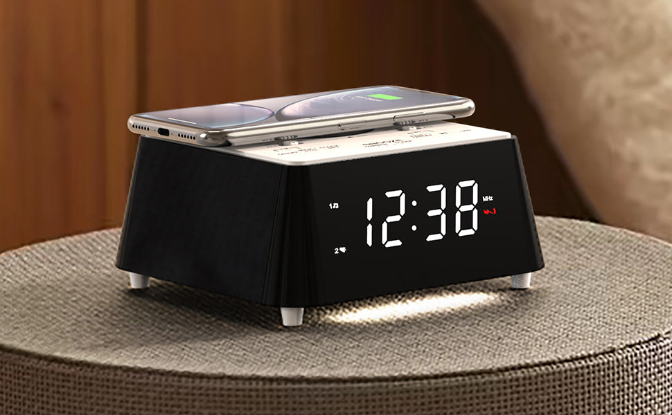 DOUBLE CHARGING CONVENIENCE: Built-in wireless charging board and USB charging port, can conveniently charge two devices at the same time. The alarm clock is not only a timer, but also a multi-functional charging solution.