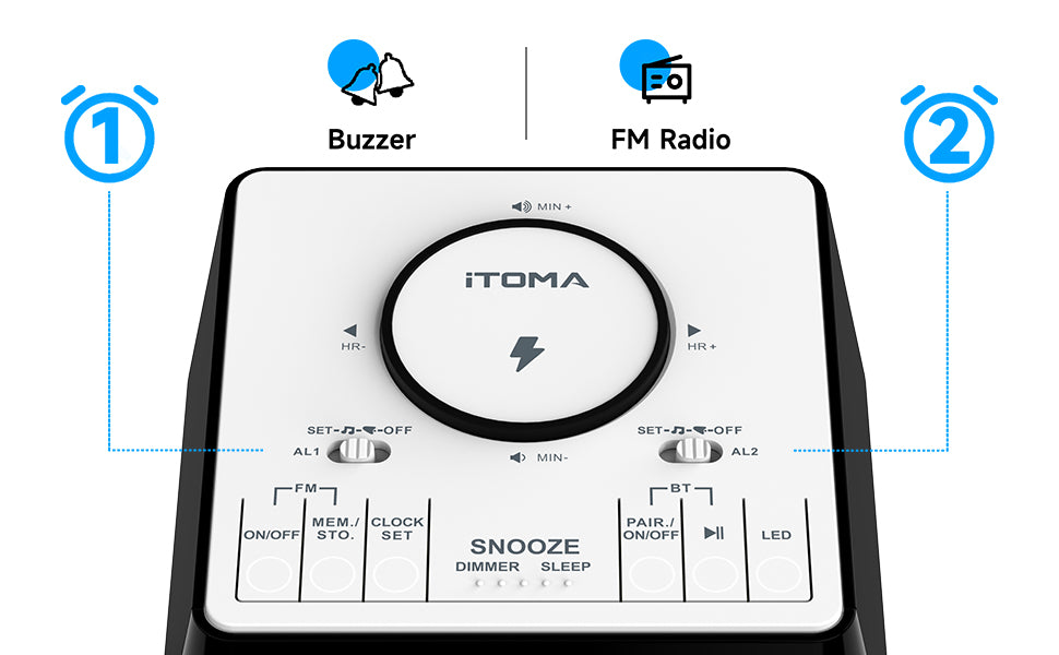 DUAL ALARM CLOCK WITH SNOOZE: Easy to set two different alarms and wake up by radio or buzzer, so it is suitable for all kinds of people, such as teen students, adults, and the elderly. And its modern and compact look can perfectly match various places like bedroom, living room, office, desktop.